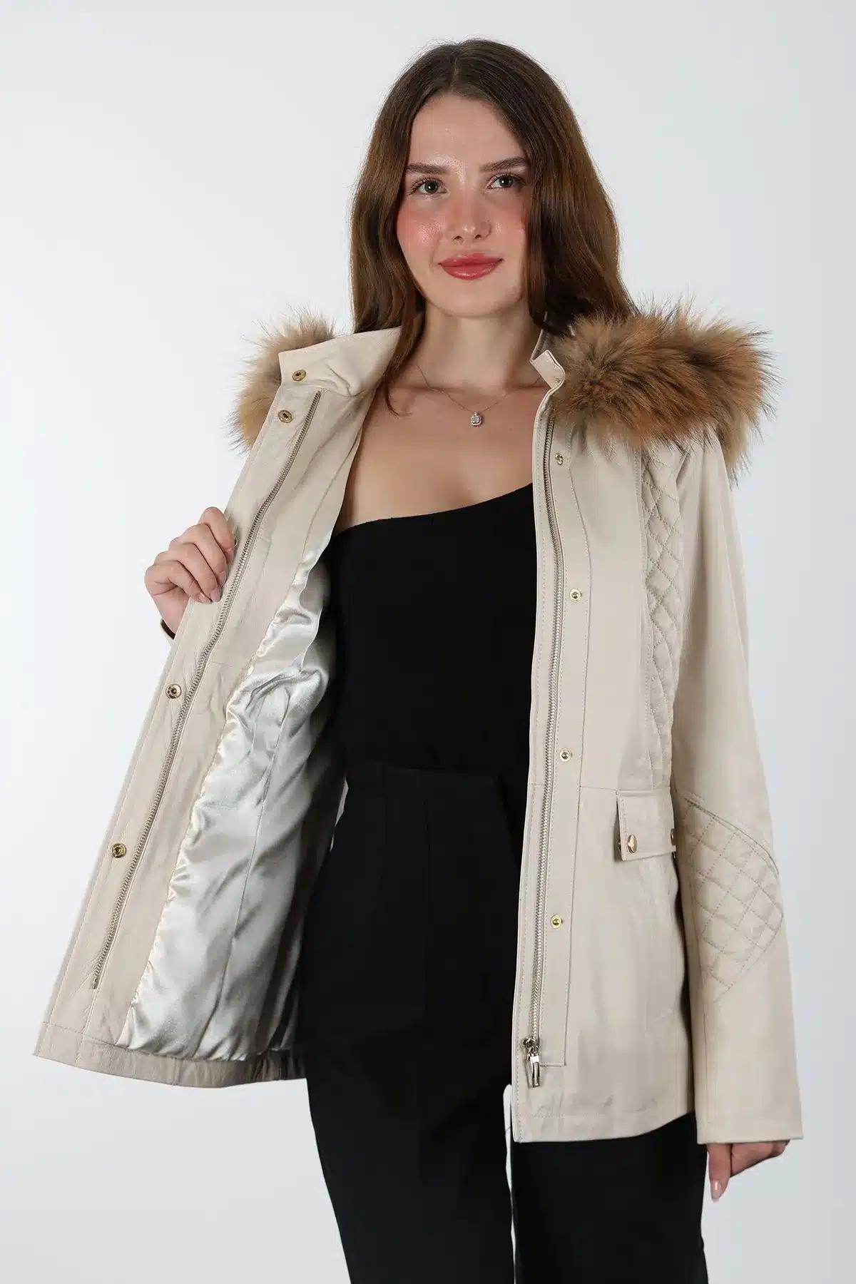 Druzy Kısa Kapüşonlu Krem Kadın Deri Ceket, modern tasarımı ve zarif görünümü ile öne çıkıyor. Yüksek kaliteli hakiki deriden üretilen bu ceket, hem şıklığı hem de konforu bir arada sunar. Günlük kullanım için ideal olan bu model, gardırobunuzun vazgeçilmez bir parçası olacak.
