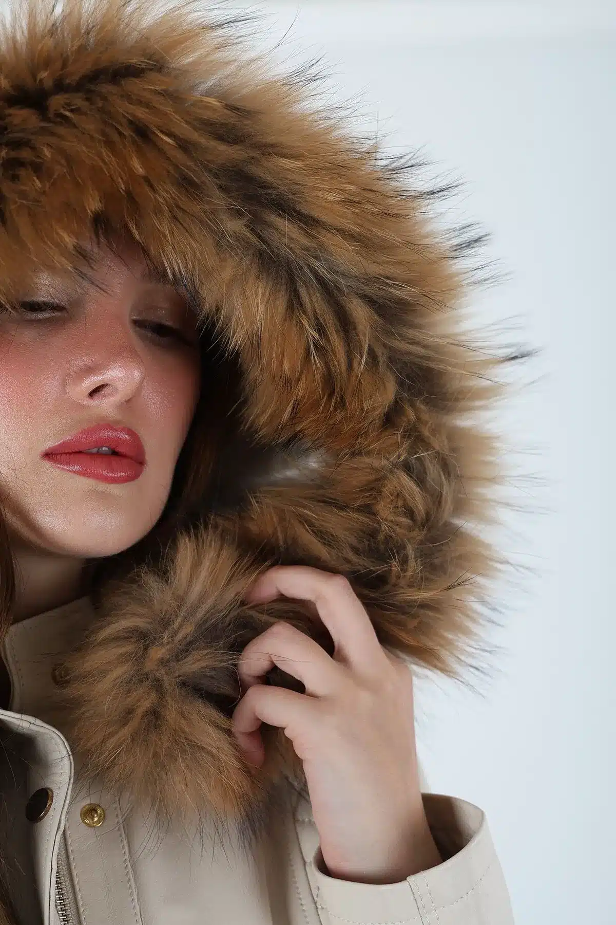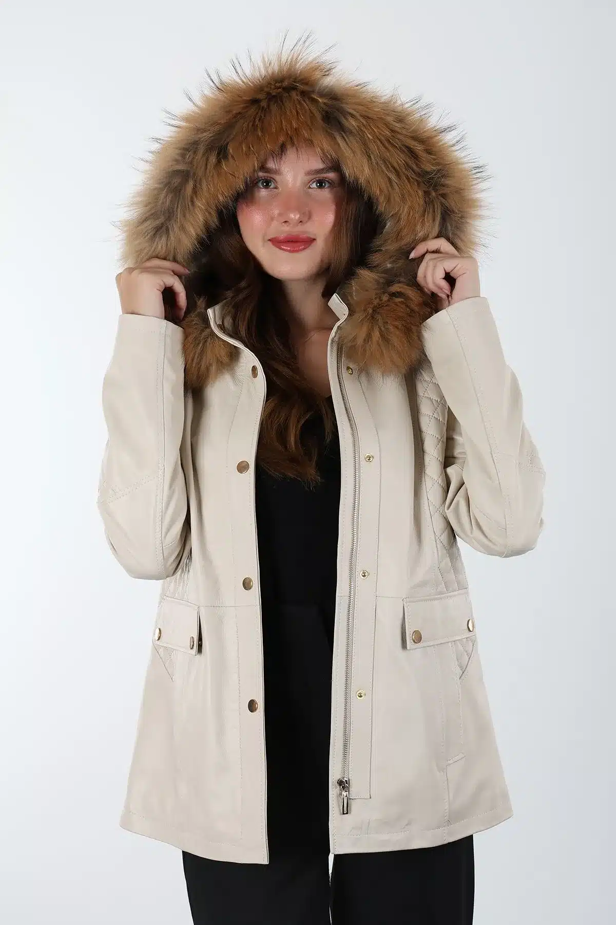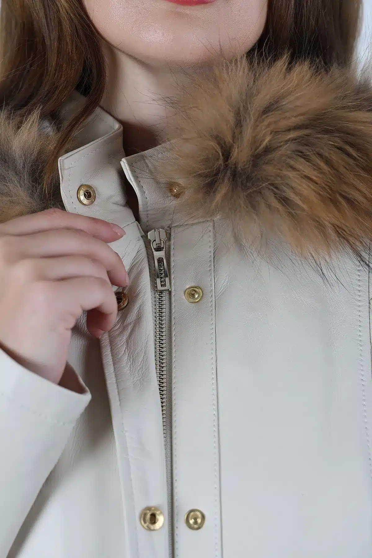 Druzy Kısa Kapüşonlu Krem Kadın Deri Ceket