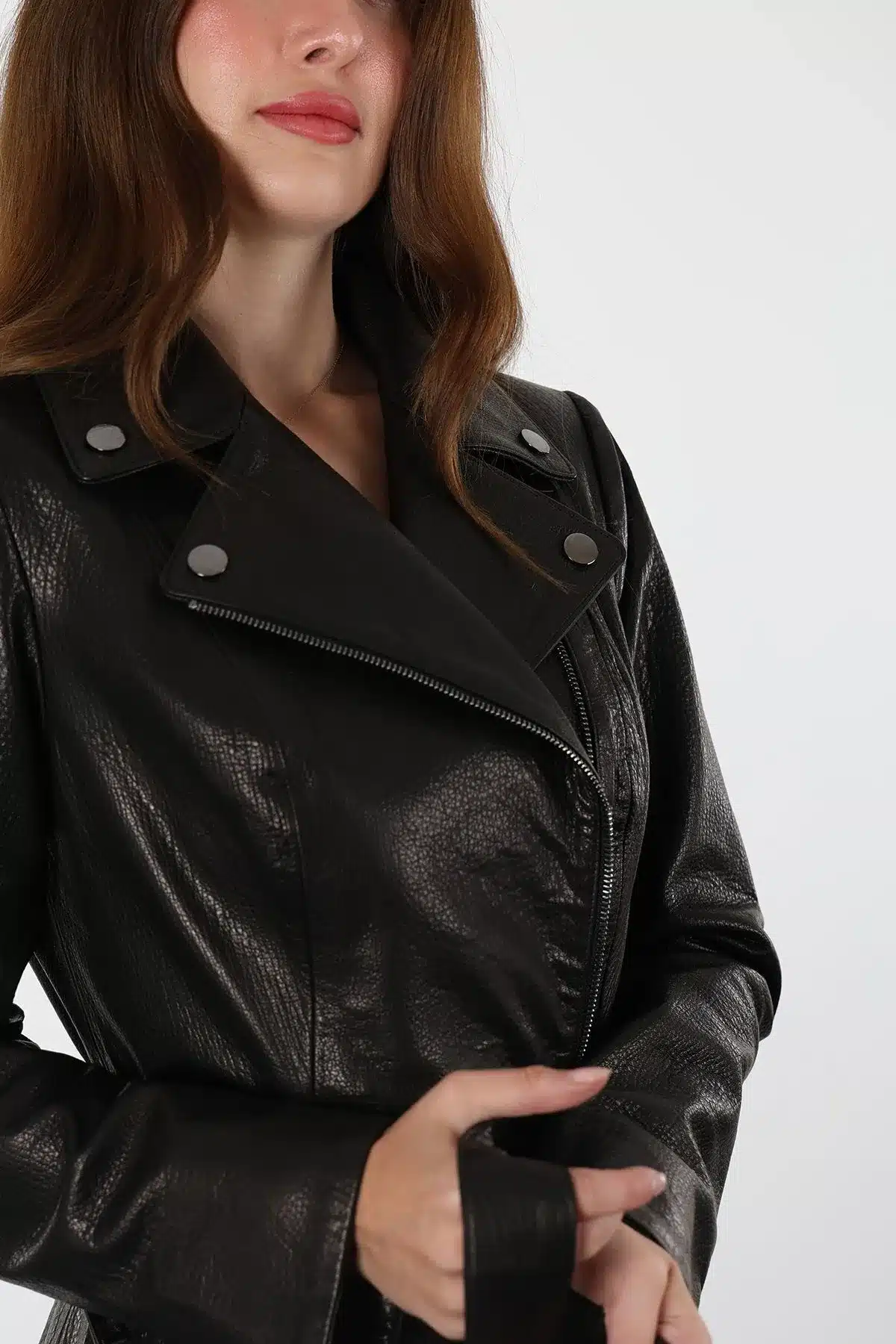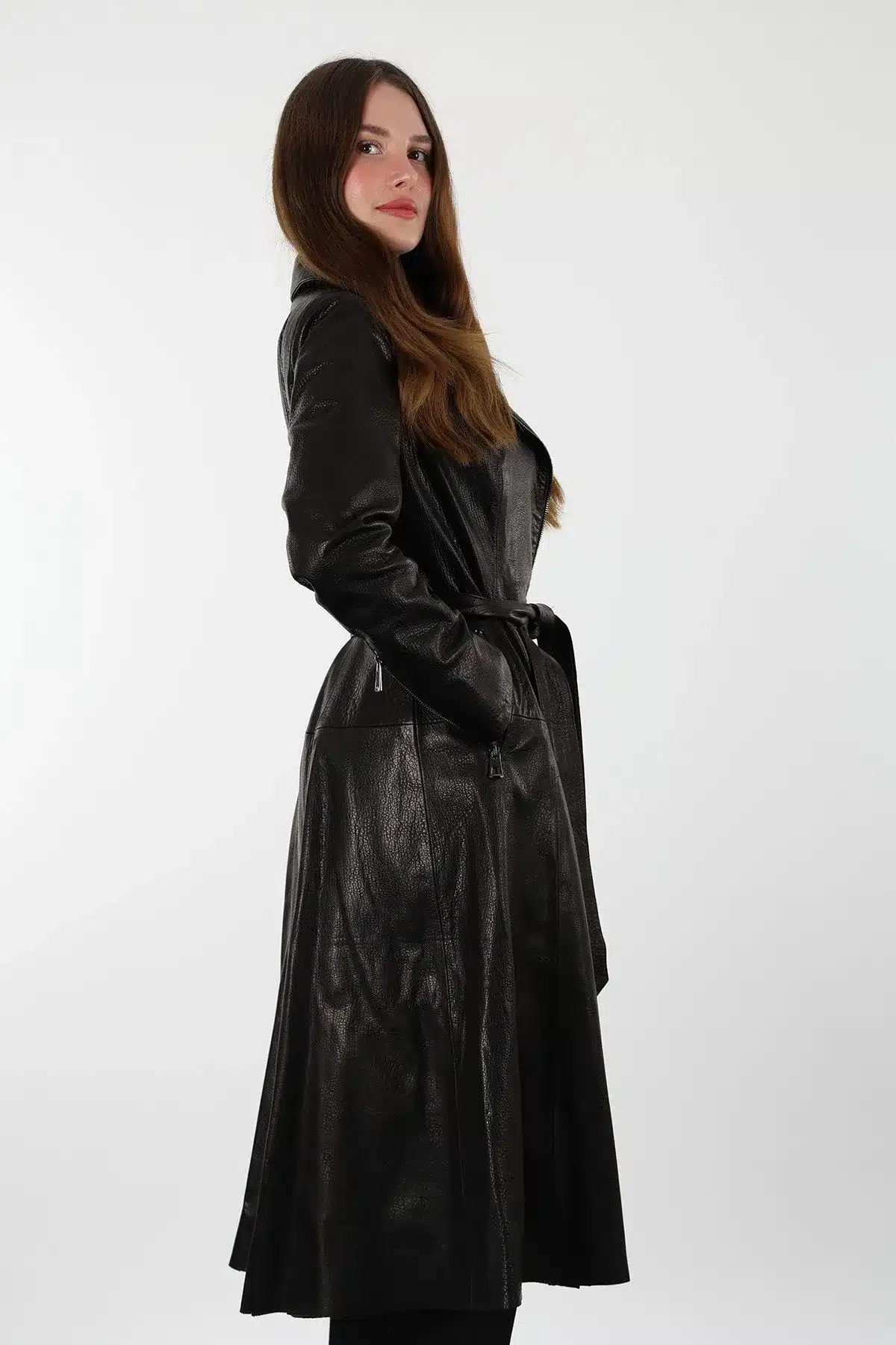Derihouse Lambert siyah uzun kadın hakiki deri ceket ile tarzınızı yansıtın. %100 gerçek deri, şık ve dayanıklı tasarım
