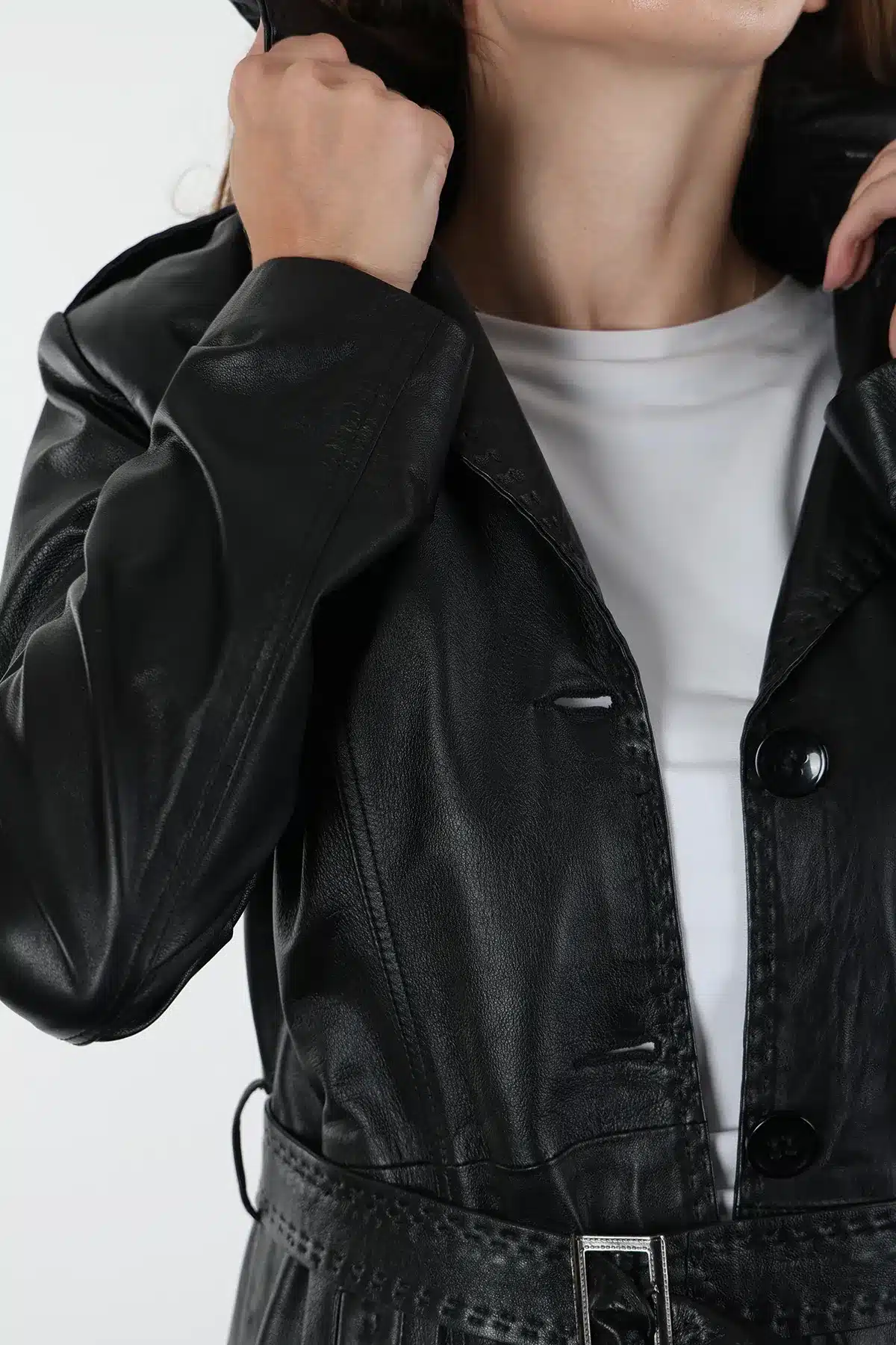 Şıklığı ve sadeliği bir araya getiren düğme ile vurulan kürksüz yapı ve kemer detayıyla, gösterişten uzak ama fark edilmeyi sevenler için tasarlandı. %100 hakiki deri ile üretilen bu ceket, hem zarif hem de dayanıklı bir seçim sunar.