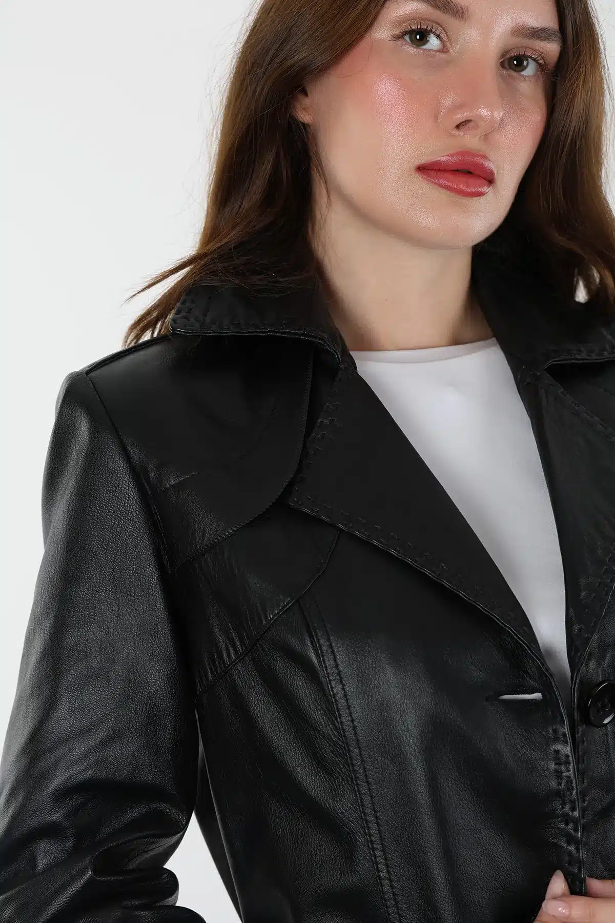 - Yumuşak deri kullanılarak üretilen Mais kadın deri ceket uzun beden boyu ile ruhundaki zarif çizgiyi dışa vuruyor. Diz boyunda uzunluk.