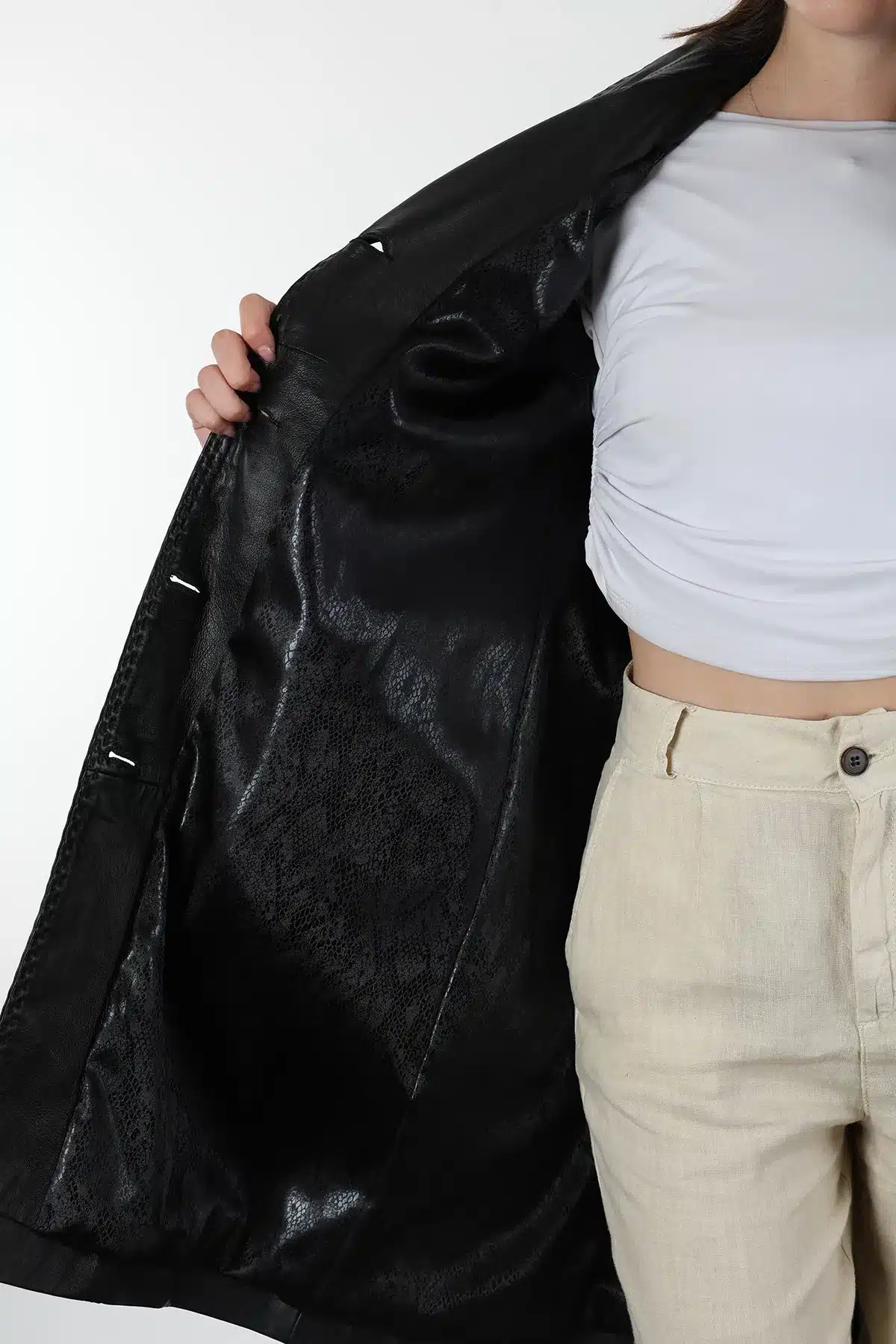 Zig Siyah Uzun Kadın Hakiki Deri Ceket